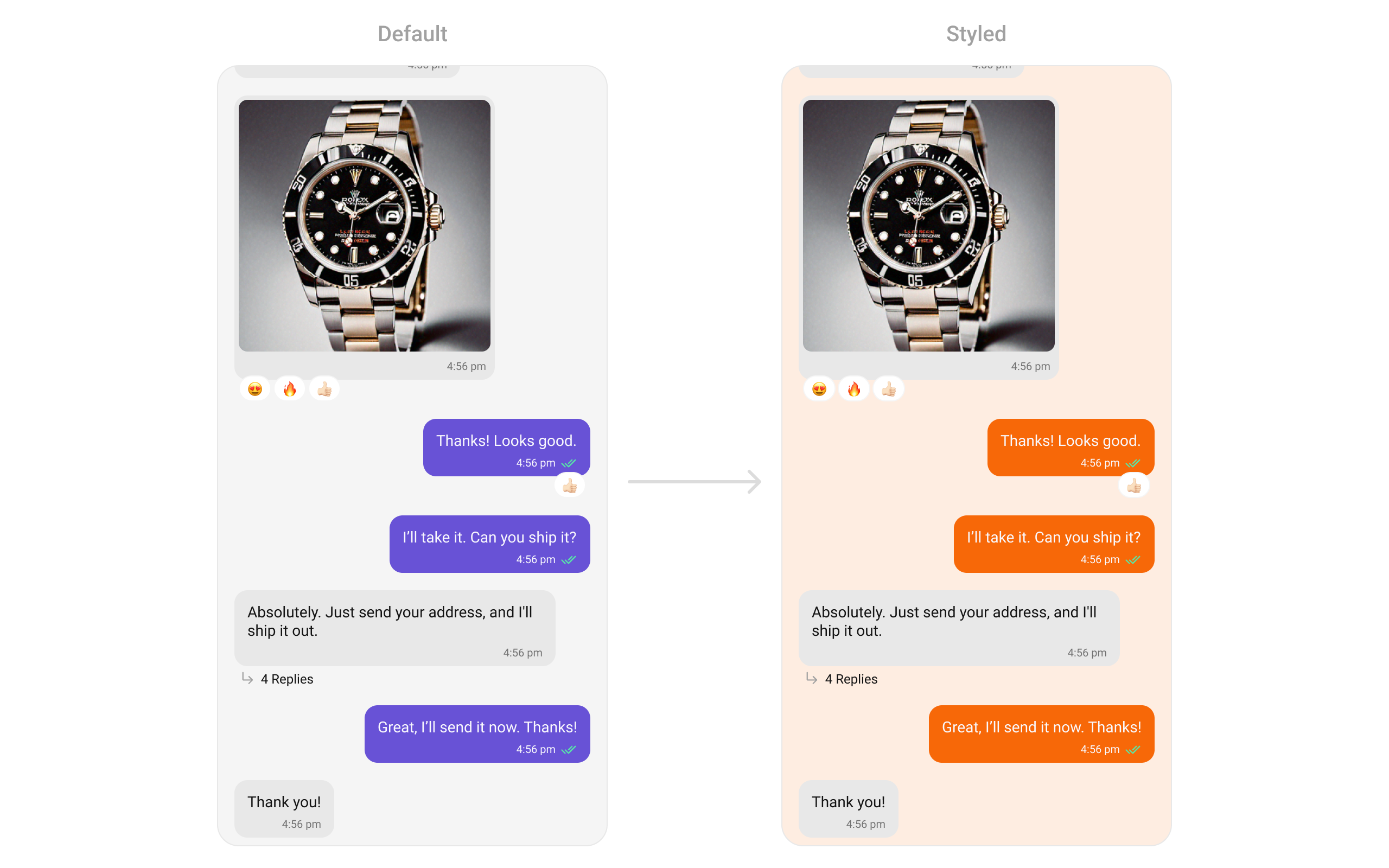 onThreadRepliesClick is triggered when you click on the threaded message bubble. The onThreadRepliesClick action doesn’t have a predefined behavior. You can override this action using the following code snippet.