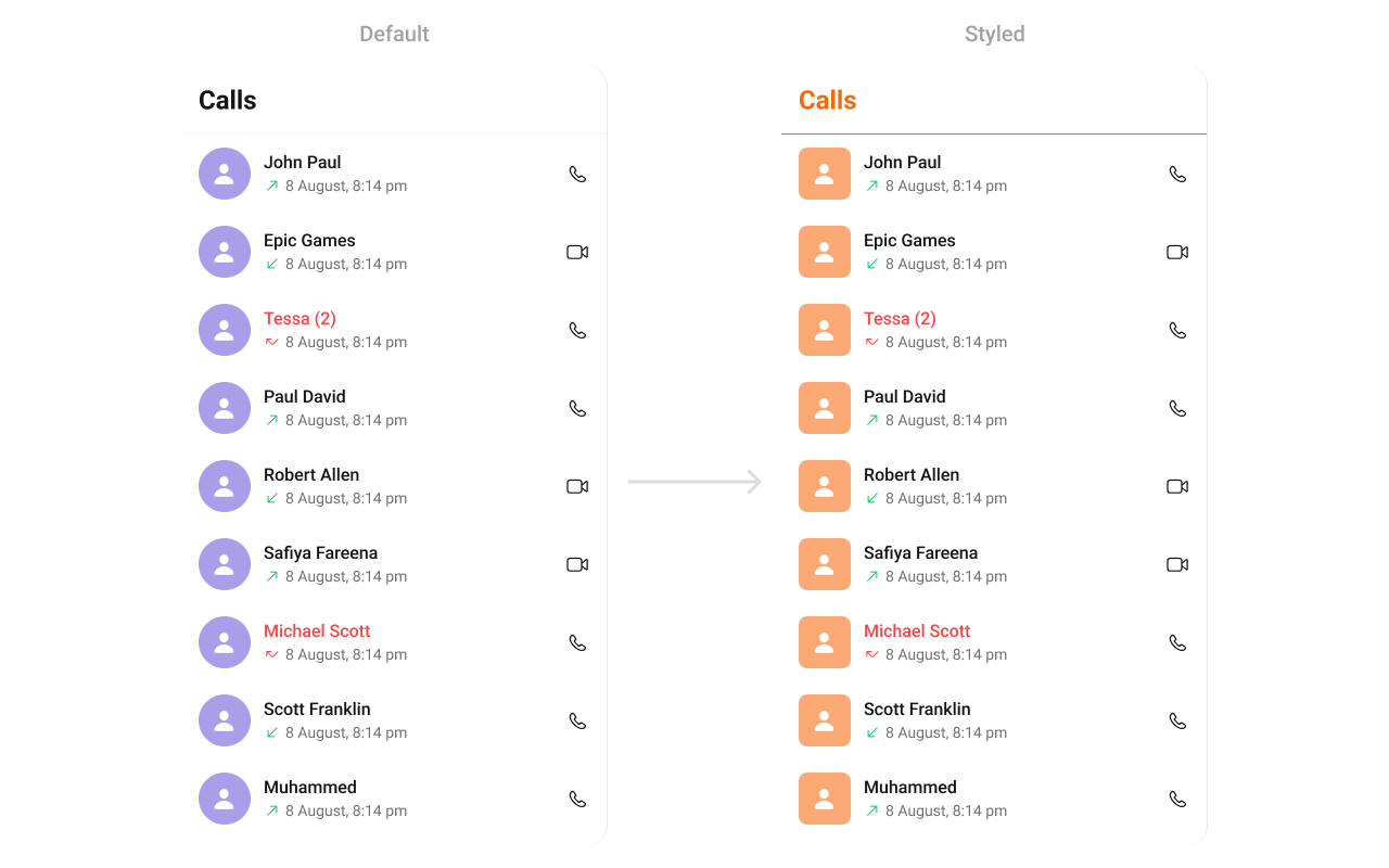 The CometChatCallLogs Component provides a comprehensive list of recent voice and video calls. Each call log displays details such as the caller’s name, avatar, call type (audio/video), call status (missed, incoming, outgoing), and timestamps. This component ensures smooth integration and allows developers to customize styles, icons, and colors to align with the app’s branding. You can check out the list of styling properties offered by CometChatCallLogs