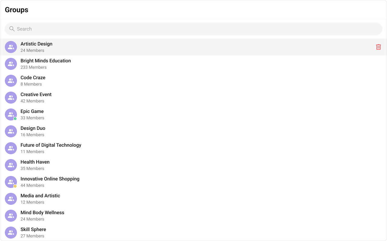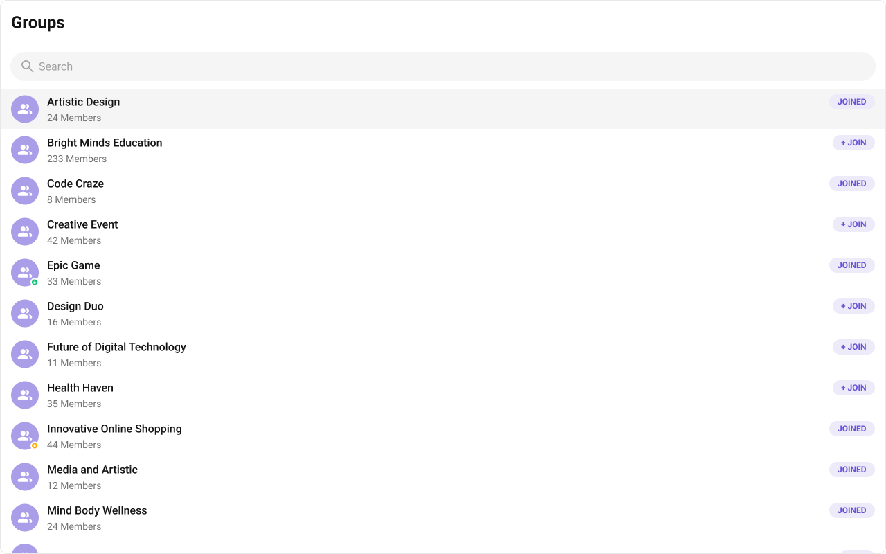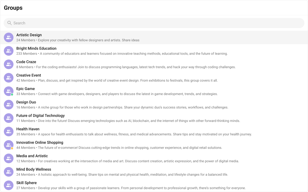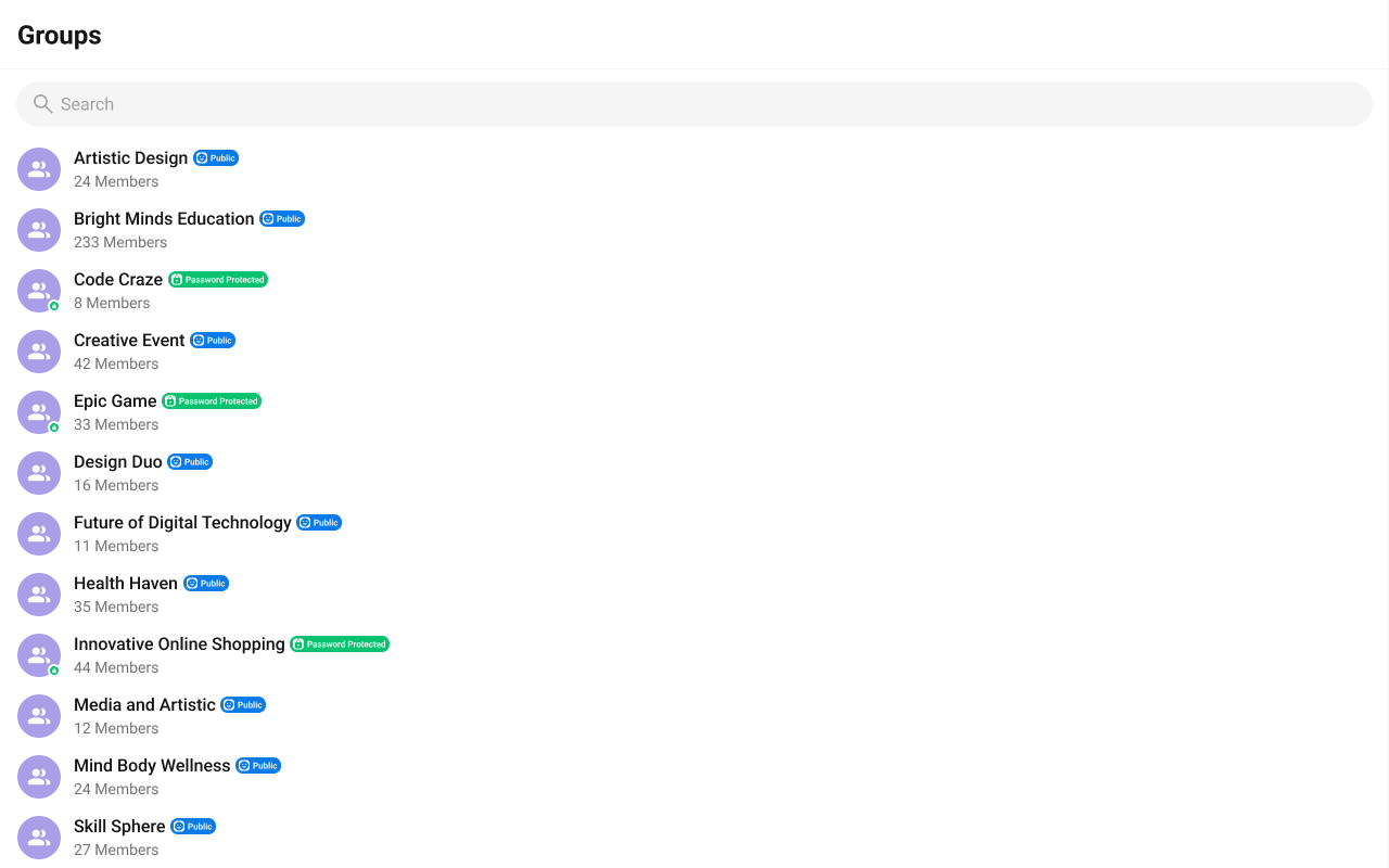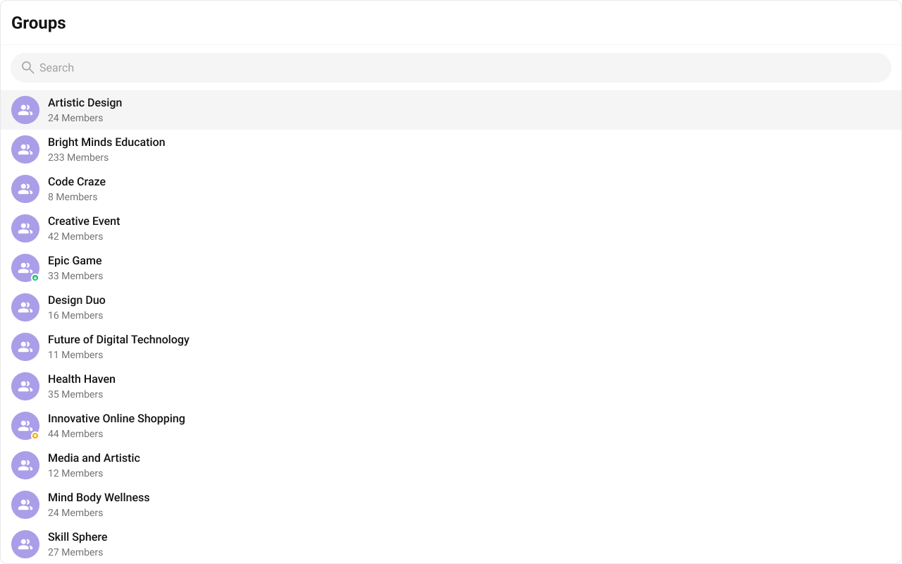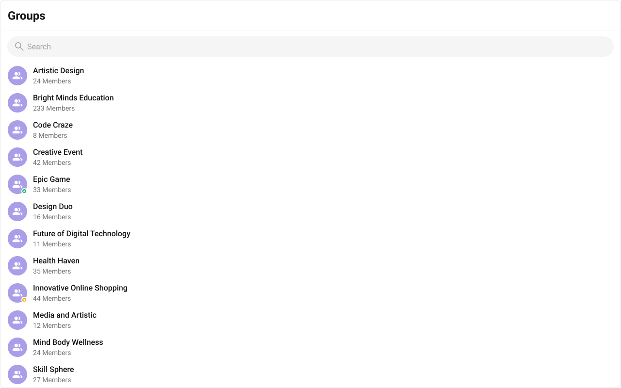 The Groups is a Component, showcasing an accessible list of all available groups. It provides an integral search functionality, allowing you to locate any specific groups swiftly and easily. For each group listed, the group name is displayed by default, in conjunction with the group icon when available. Additionally, it provides a useful feature by displaying the number of members in each group as a subtitle, offering valuable context about group size and activity level.